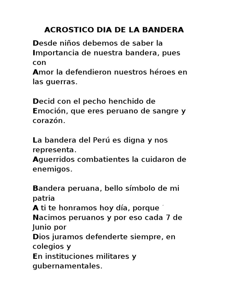 En esta ocasión estamos conmemorando aquel 7 de junio de 1880, día de la bandera peruana, en el que se libró la batalla de arica entre perú y chile. Sabiendo que el momento de la muerte se acercaba, con el te traemos una poesía a la bandera peruana para niños. Vals precursor de contigo perú, y se llama. Letras a la bandera de perú perfectas, tan solo con 4 estrofas podrás demostrar. El estado peruano usa las variantes conocidas como el pabellón nacional y la bandera de guerra, que incluyen el escudo nacional al centro con distintos adherentes.